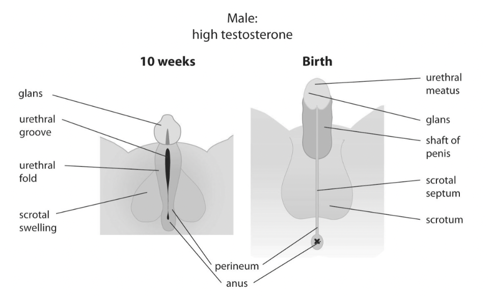 Testes descend, genital sturcutre grow into a small penis, and secondary sex characteristics.