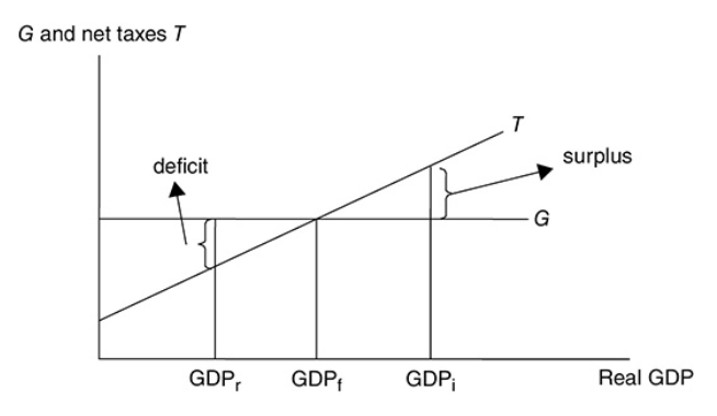- When GDP is falling, households and firms are in lower tax brackets decreasing the percentage of income tax received. This provides more consumption than at a higher tax rate and since a weak economy increases the need of transfer payments, net taxes decrease with GDP. * Automatic stabilizers lessen, but do not eliminate, the business cycle swings. * Automatic stabilizers lead to deficits during recession and surpluses during economic growth.