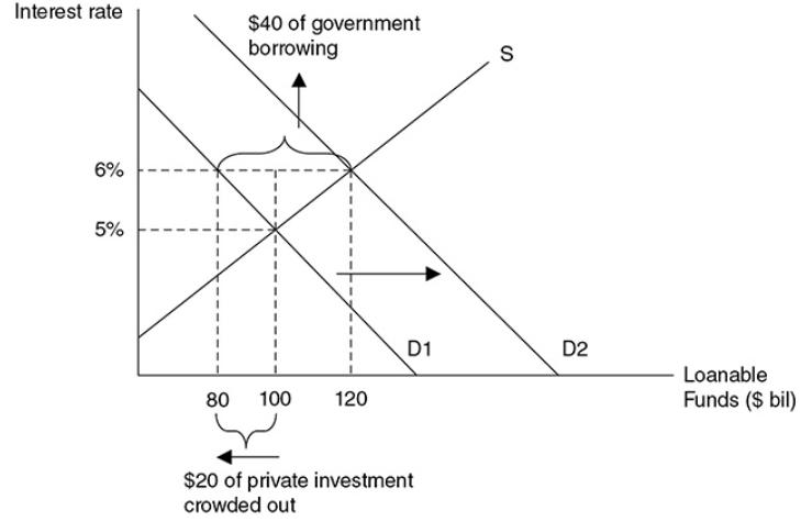 - ^^Ex. →^^ Suppose that government fiscal policy creates a $40 billion budget deficit. To cover the deficit, the government must borrow $40 billion in the market for loanable funds. The new demand curve (D2) is the original demand curve laying $40 billion to the right of D1. The new market equilibrium interest rate is 6%, and $120 billion is saved and invested. But remember that of this $120 billion, $40 billion is due to borrowing by the government. That leaves $80 billion in private borrowing and investment. So the government budget deficit caused private borrowing and investment to fall from $100 billion to $80 billion, and that is where we see the crowding out of $20 billion in private investment.
