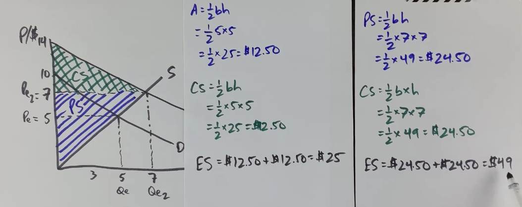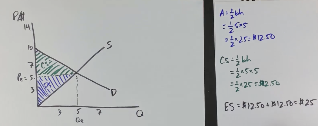 Total economic surplus is maximized at equilibrium, even if consumer surplus (CS) and producer surplus (PS) are unequal.