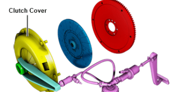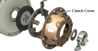 this disengages the clutch by pulling the pressure plate forward, away from the clutch cover towards the clutch disc.