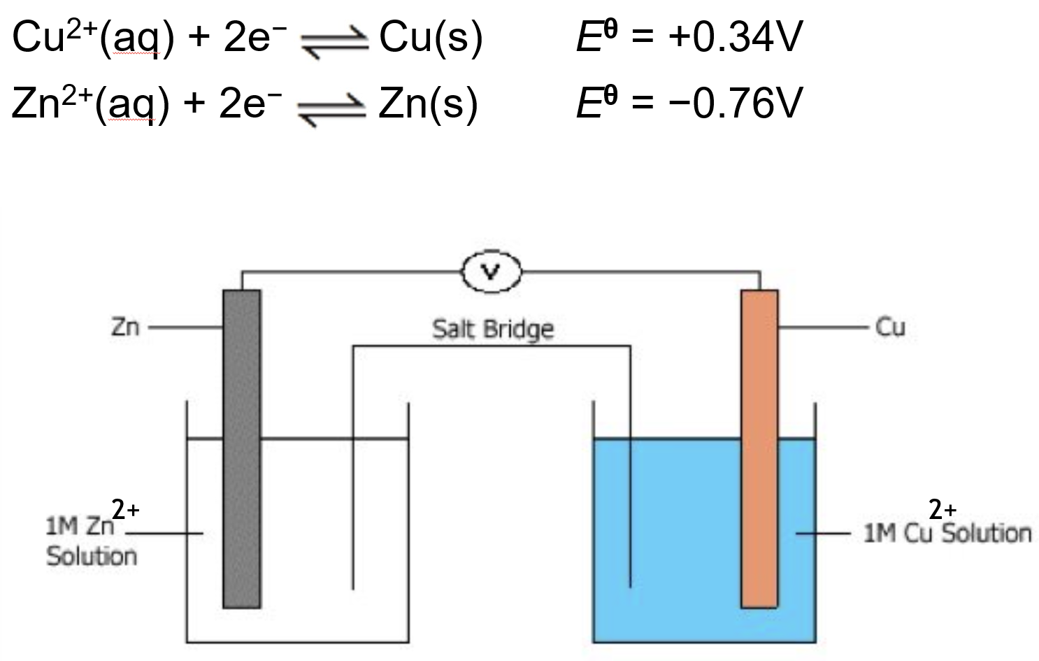 Cu2+(aq) + 2e- ⇌ Cu(s) E0 = +0.34V (forwards, reduced)