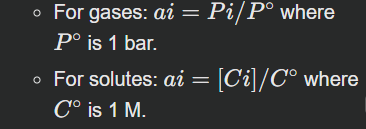 For pure solids/liquids: ai=1 (their concentration doesn't change significantly during the reaction).