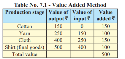 alue added at each stage is calculated bydeducting the value of inputs from the value of output produced. The sum total added at different stages make GNP. In the above table the value of final good (Shirt) is