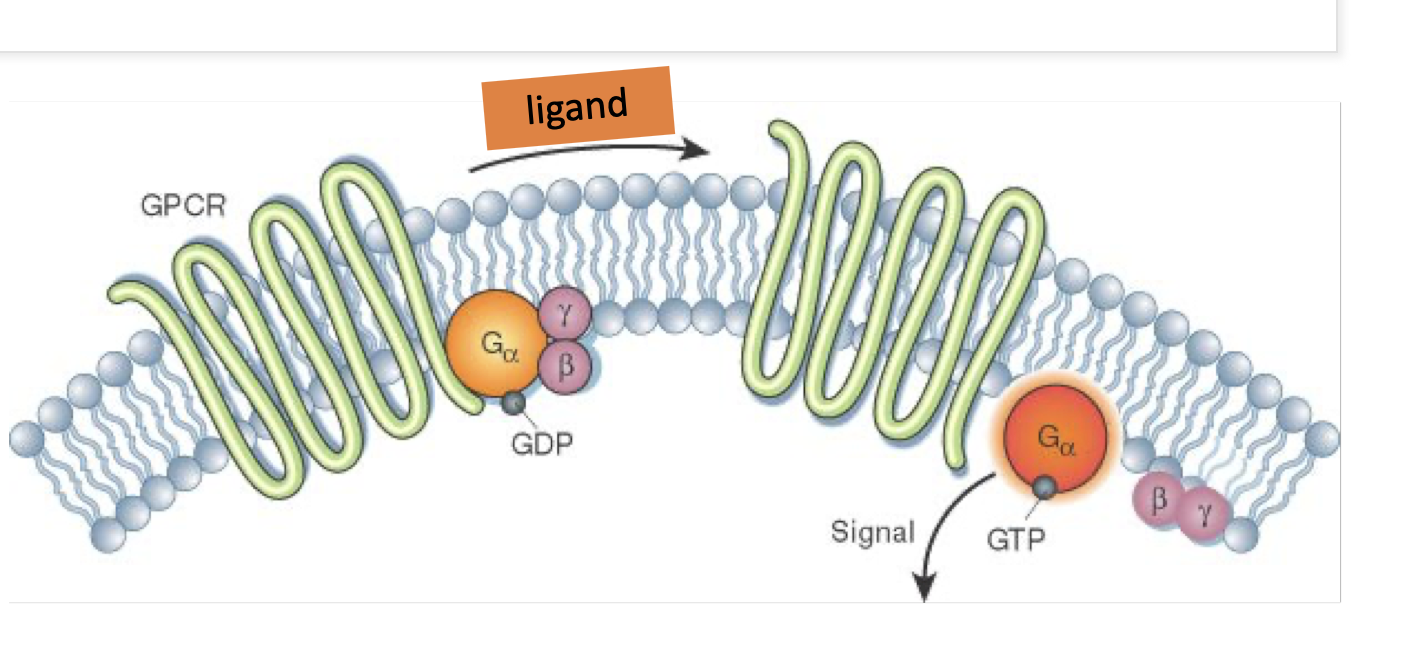 Ligand—phân tử tín hiệu—gắn vào GPCR, which changes the bound G protein by replacing GDP with GTP—> kích hoạt G protein