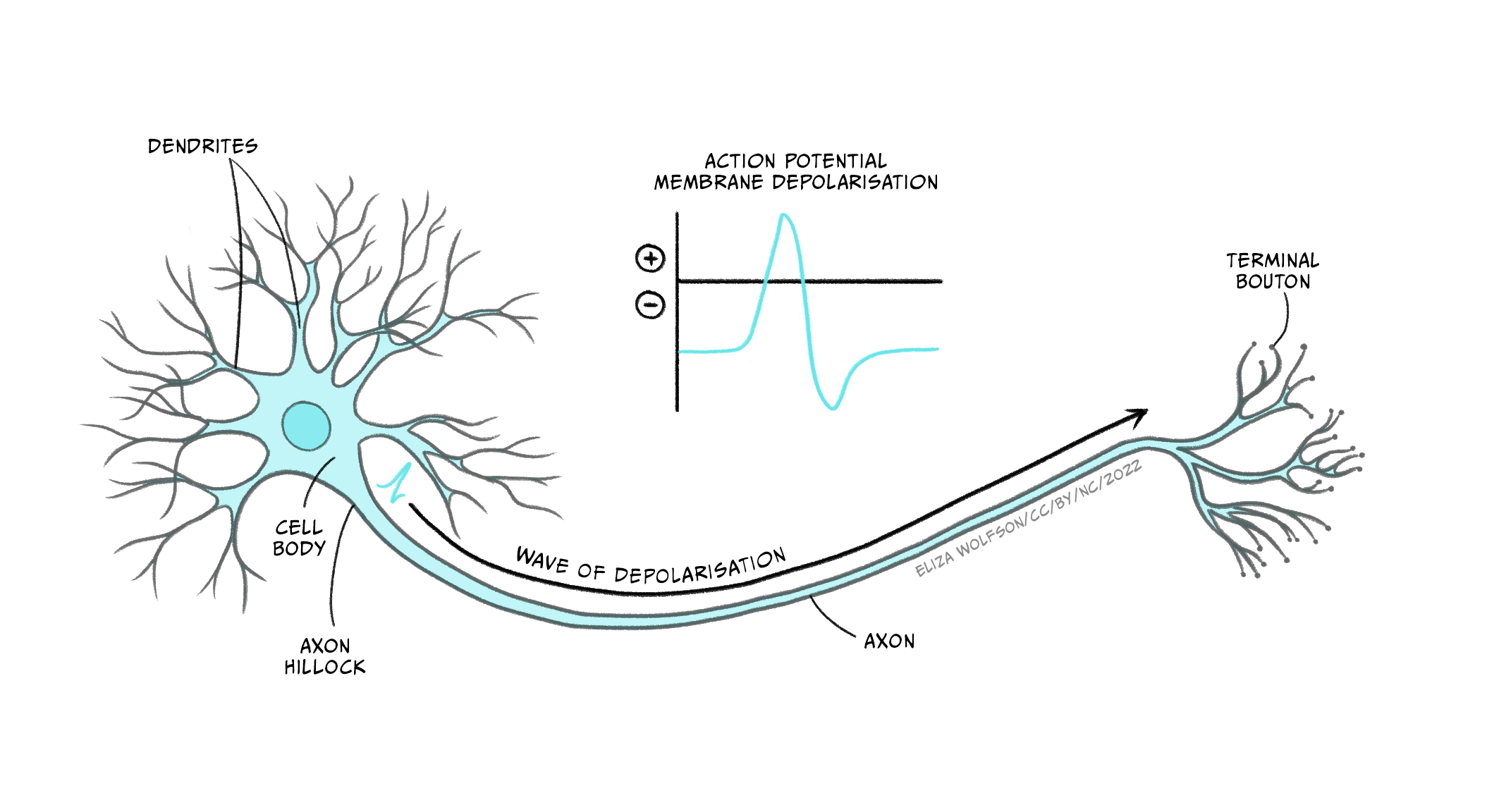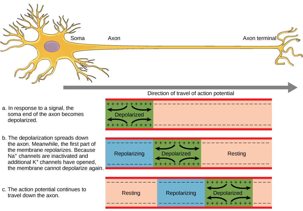 • Open channels ⇒ rushes in (↑ positivity) ⇒ MP moves toward & beyond.Repolarisation: return to resting negativity.