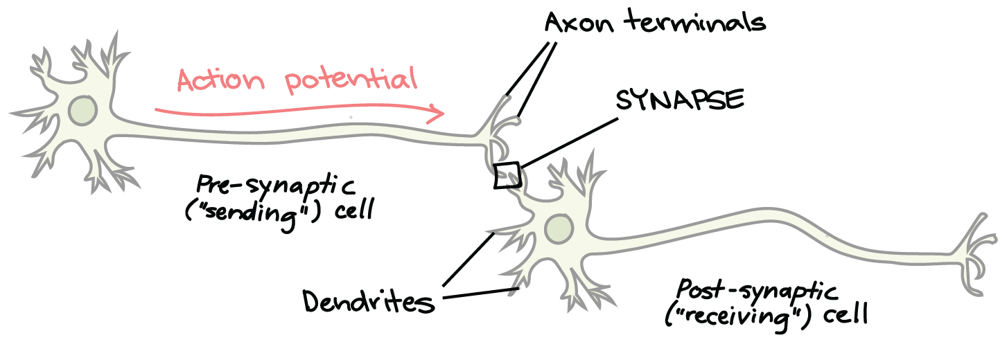 • Post-synaptic = after synapse (receiving cell).
