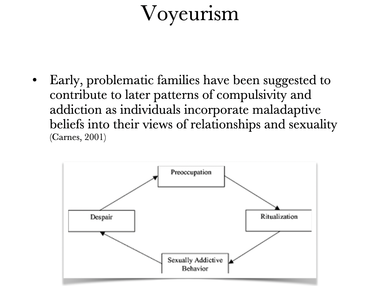 Voyeurism is an overextension of an evolutionary trait, where visual stimuli are used in the reproductive selection process (Kaplan & Kreuger, 1997)