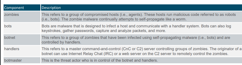 • The following terms are used to describe DDoS attacks: zombies, bots, botnet, handlers, and botmaster.