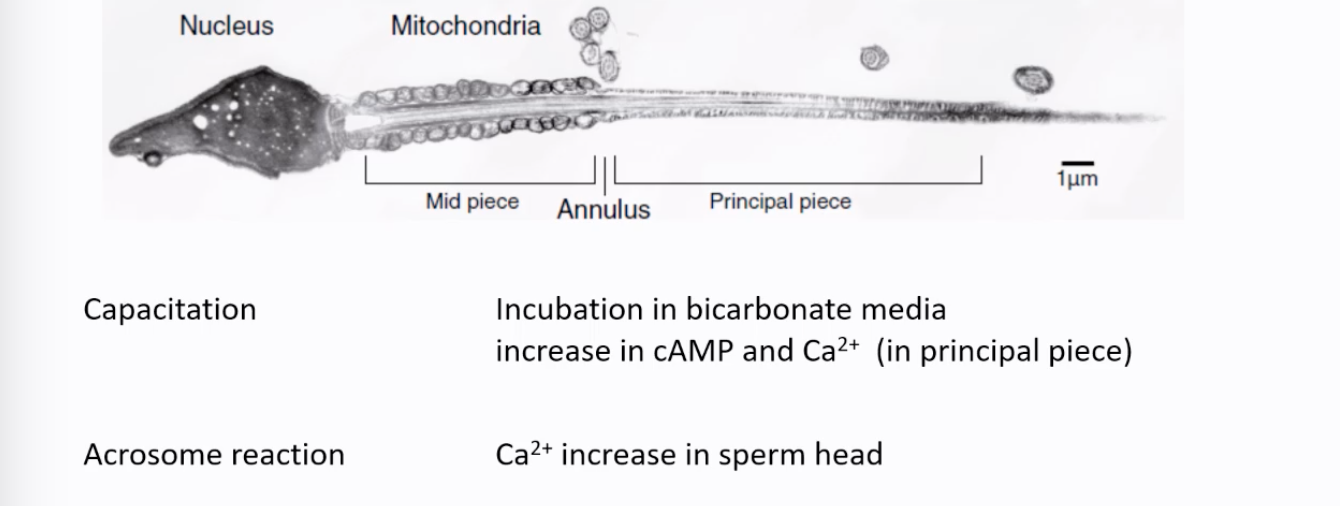 Sperm Structure: A mature spermatozoon consists of a head (containing the nucleus with condensed DNA and the acrosome), a midpiece (packed with mitochondria for ATP and glucose for glucose to pyruvate, like skeletal muscle), and a tail or principal piece (for motility). The annulus is a ring-like structure between the midpiece and principal piece.
