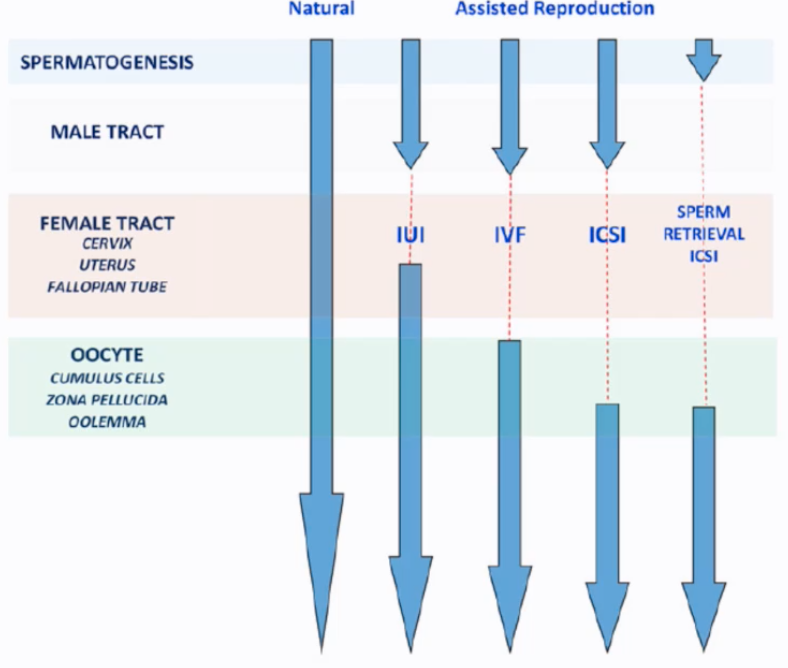 Sperm Retrieval + ICSI: Used when there is no sperm in the ejaculate (azoospermia), sperm are retrieved directly from the epididymis or testes and used for ICSI. This bypasses spermatogenesis completion (in terms of release) and the entire male tract transport.