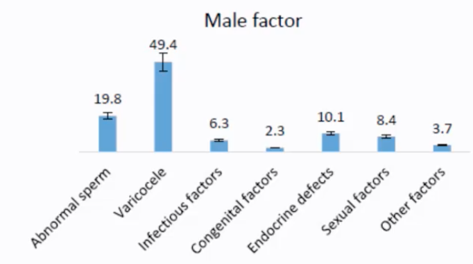 Varicocele (enlarged veins in the scrotum, potentially affecting sperm production, ~49.4% - note: this high percentage for varicocele as a specific listed cause seems unusually prominent compared to "abnormal sperm" in general; typically, abnormal sperm parameters are the most common finding, with varicocele being one potential underlying cause)