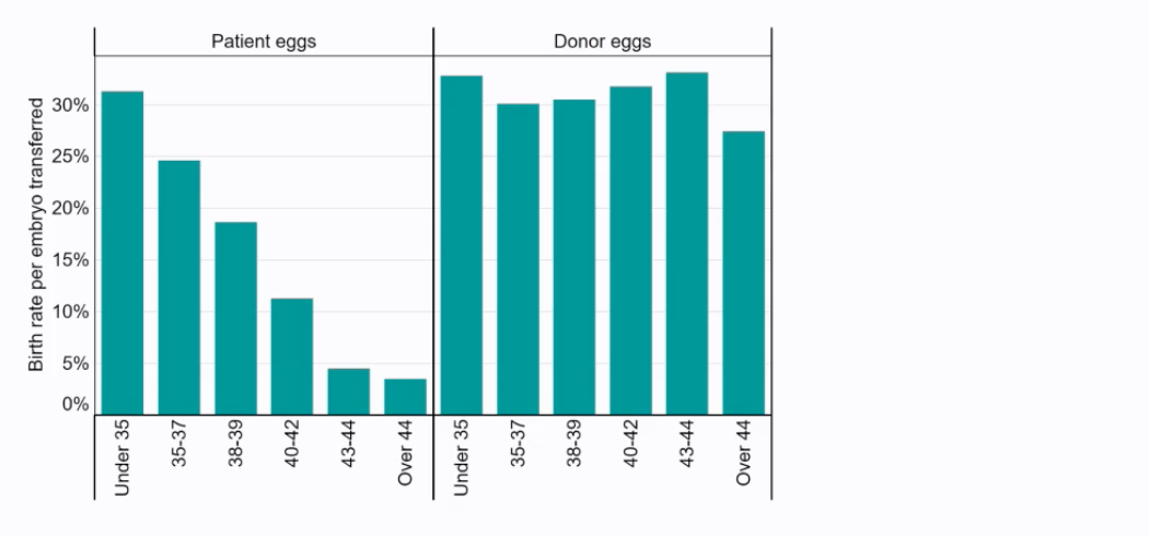 In contrast, when donor eggs (typically from younger women) are used, the birth rate per embryo transferred remains relatively high and consistent across different recipient age groups (around 27-33%), even for recipients over 44. This indicates that the uterine environment is often still capable of supporting pregnancy if a healthy embryo is available.
