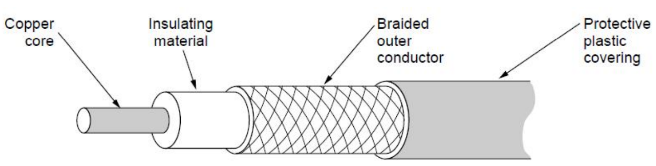 Coaxial cable: Better shielding and more bandwidth for longer distances and higher rates than twisted pair.