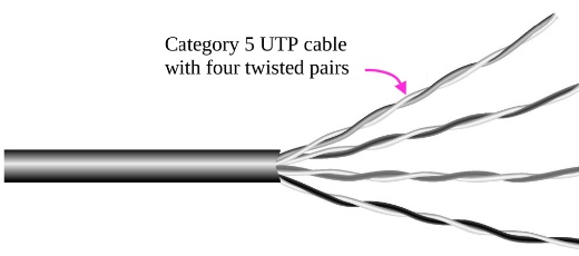 Twisted pairs: Very common, used in LANs, telephone lines. Twists reduce radiated signal (interference).