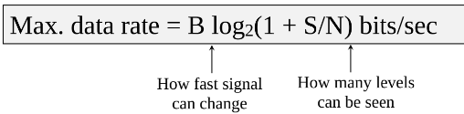 where is bandwidth, is signal strength, and is noise. This theorem relates data rate to bandwidth and signal strength relative to noise, determining how many levels can be seen.