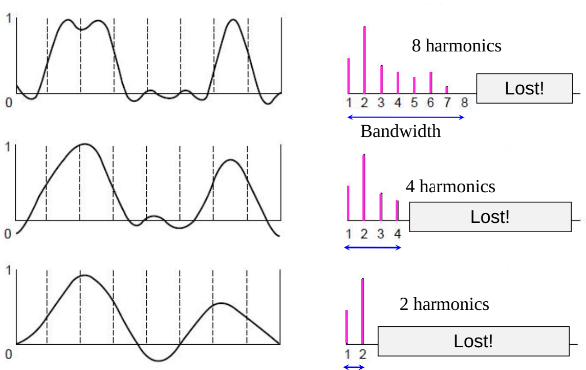 Bandwidth-limited signals: Having less bandwidth degrades the signal, resulting in loss of harmonics.