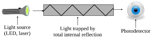 Light source (LED, laser) and photodetector are used. Light sources, such as LEDs or lasers, are used to generate the light pulses, and photodetectors are used to detect the light pulses at the receiving end.