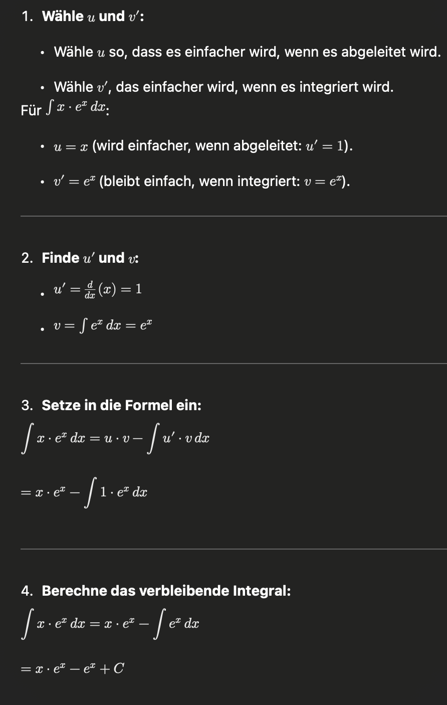 Суть в том чтобы понять что нужно ableiten, а что integrieren (обычно e^x ) чтобы в итоге было легче интегрировать все.
