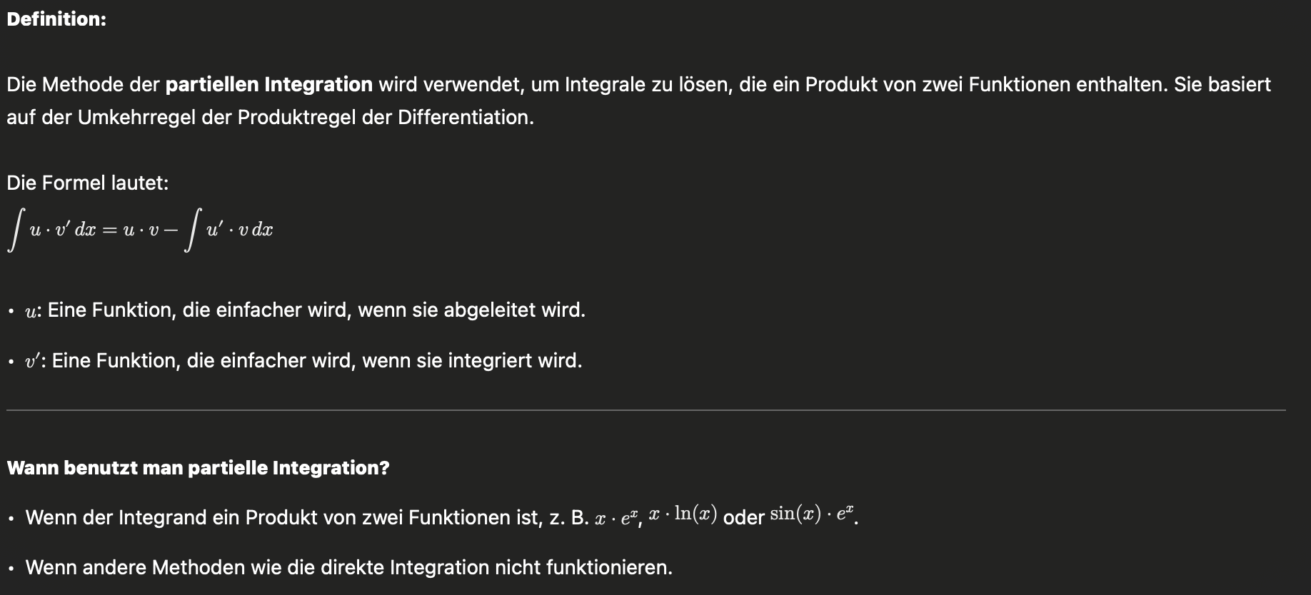 Partielle Integration: - man benutzt bei Multiplikation von 2 Funktionen (keine Konstante, keine x, aber was schwierigeres)