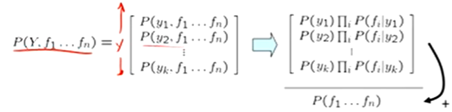 P(Y, F1 … Fn) = P(Y) ∏ P(Fi | Y)