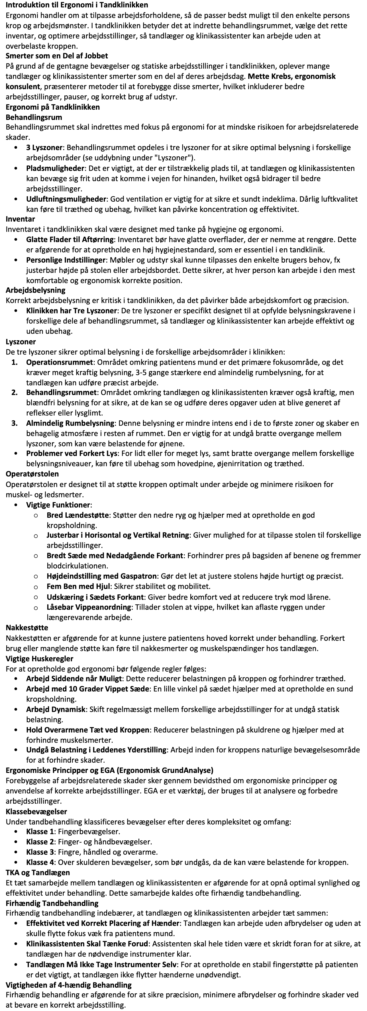 Ergonomi handler om at tilpasse arbejdsforholdene, så de passer bedst muligt til den enkelte persons krop og arbejdsmønster. I tandklinikken betyder det at indrette behandlingsrummet, vælge det rette inventar, og optimere arbejdsstillinger, så tandlæger og klinikassistenter kan arbejde uden at overbelaste kroppen.
