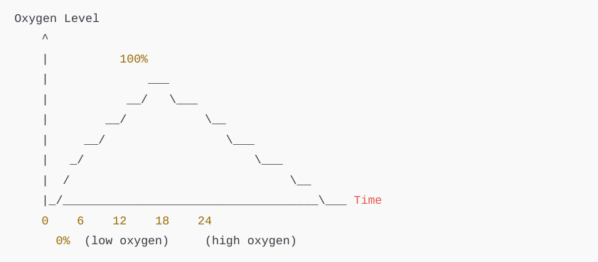 3. 12-18 hours (Noon to 6 PM): Oxygen levels are at their highest. Reason: Midday to afternoon photosynthesis peaks because sunlight is most potent. During this period, the plants produce the maximum amount of oxygen, so oxygen levels in the jar should be at their highest. I placed the bar at 100% to represent the peak oxygen level when photosynthesis is most efficient.