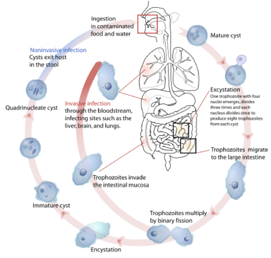 - Parasite bites and consumes sections of the host cell membrane, cytoplasm, and organelles