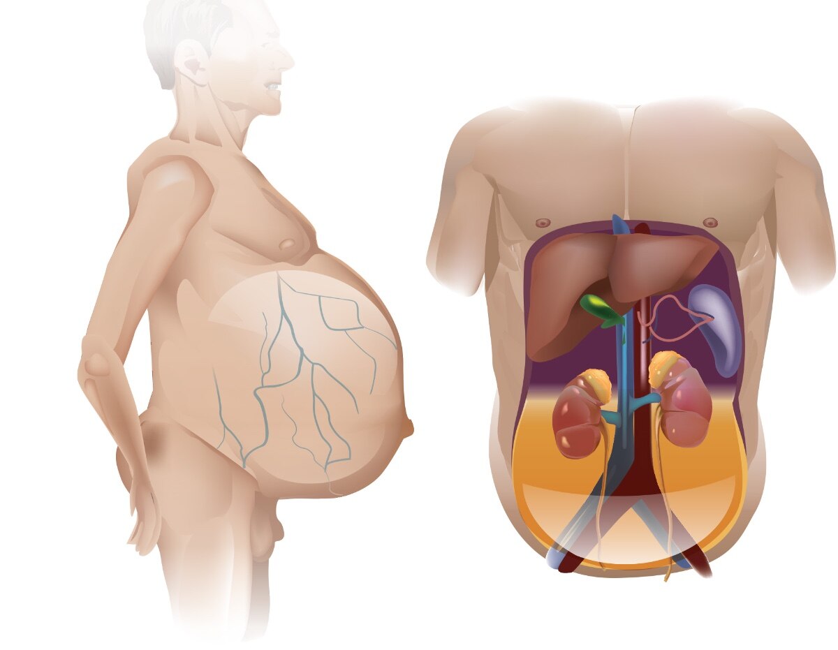 Male client's body showing Grey-Turner's sign on the side of stomach, Cullen's sign on the stomach above belly button, and Fox's sign on the groin and inner thigh