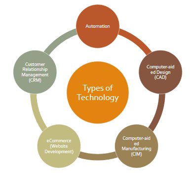 Strategies to improve both the efficiency and effectiveness of operations related to technological development, including the use of automated production lines, robotics, computer-aided design, computer-aided manufacturing techniques, artificial intelligence, and online services.