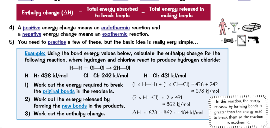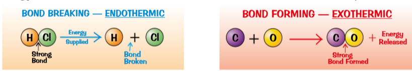Exothermic Reactions: Release energy when forming bonds; the energy released is greater than the energy needed to break the bonds.