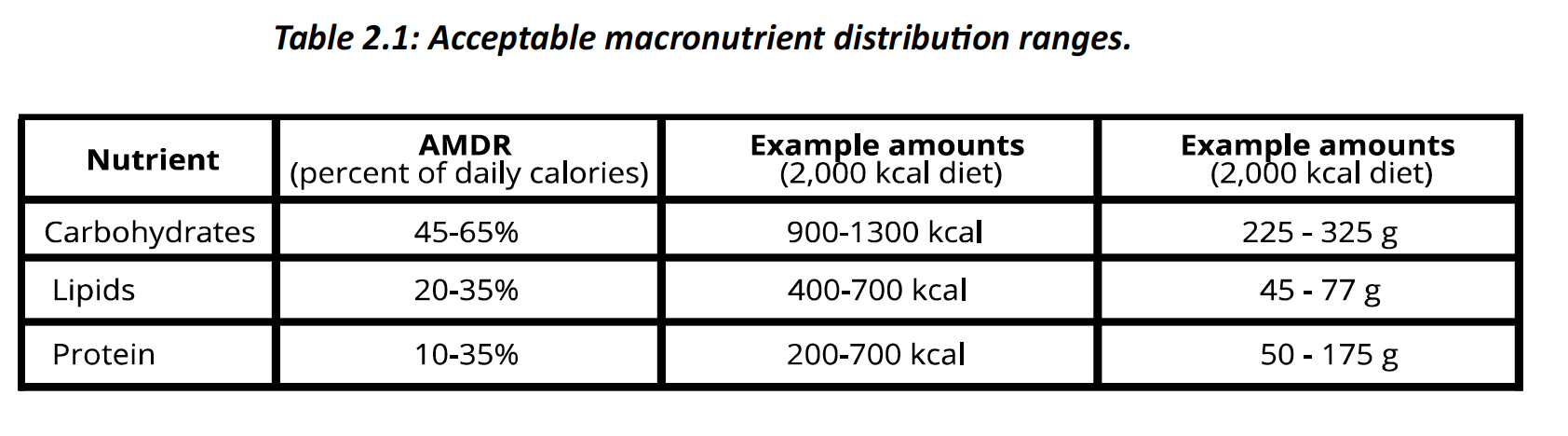 The acceptable macronutrient distribution range outlines the recommended percentage of energy that should come from each of the three energy-yielding nutrients: carbohydrates, lipids and proteins.