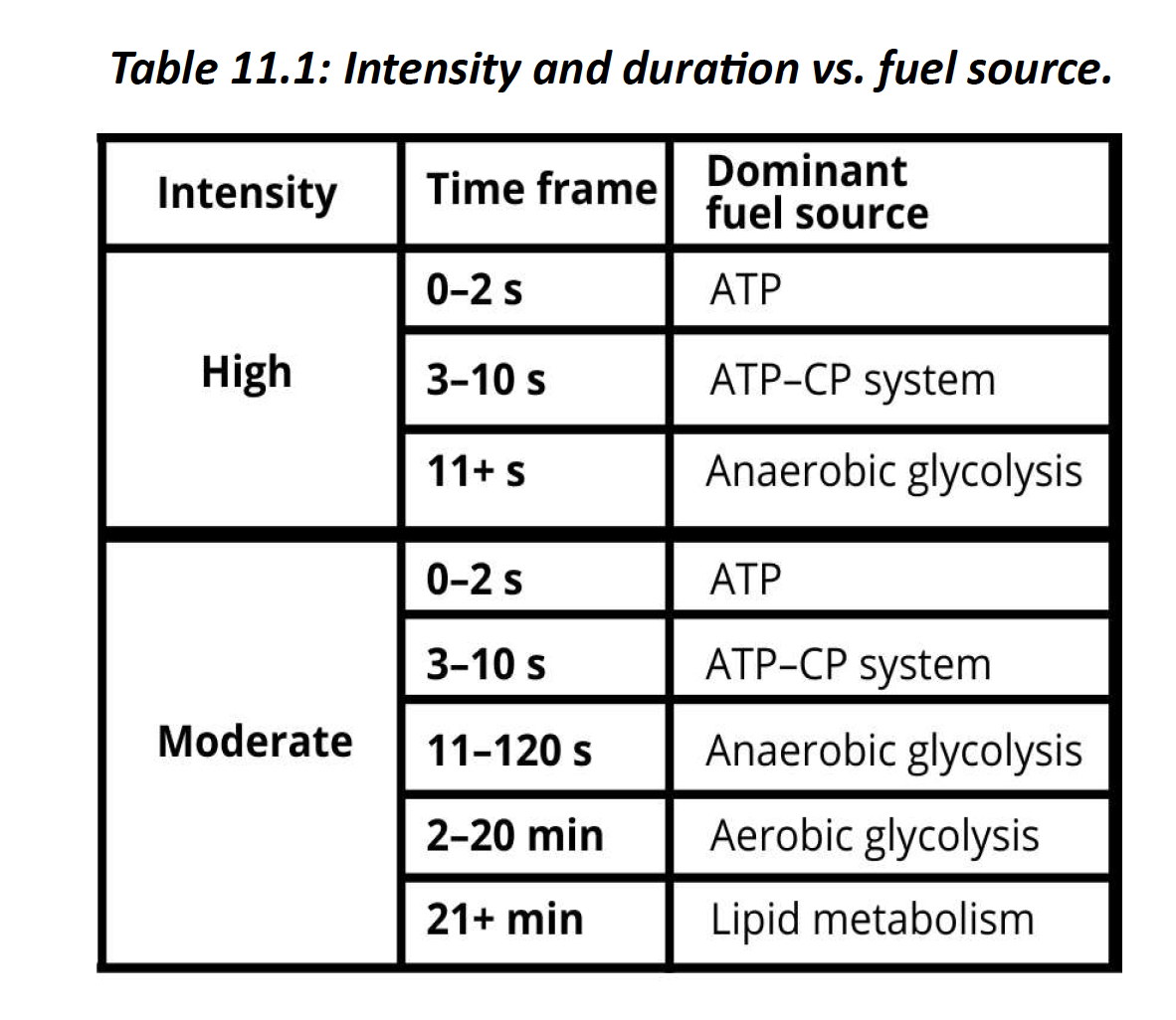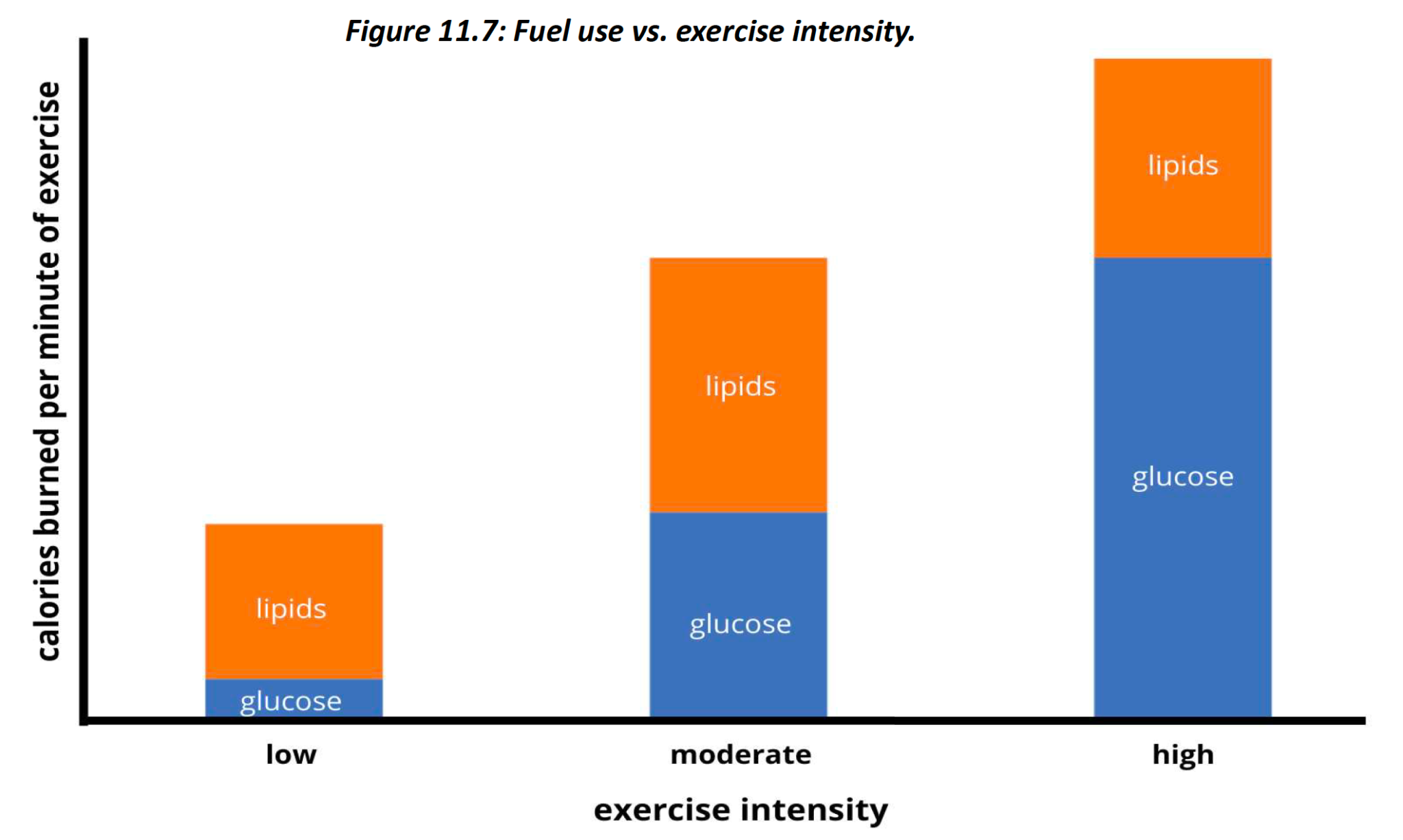 Low- to moderate- intensity activities put us in the aerobic zone. That means that the preferred fuel source will depend on the duration of the activity, as discussed above. For moderate activities lasting longer than 20 minutes, lipids are the preferred fuel