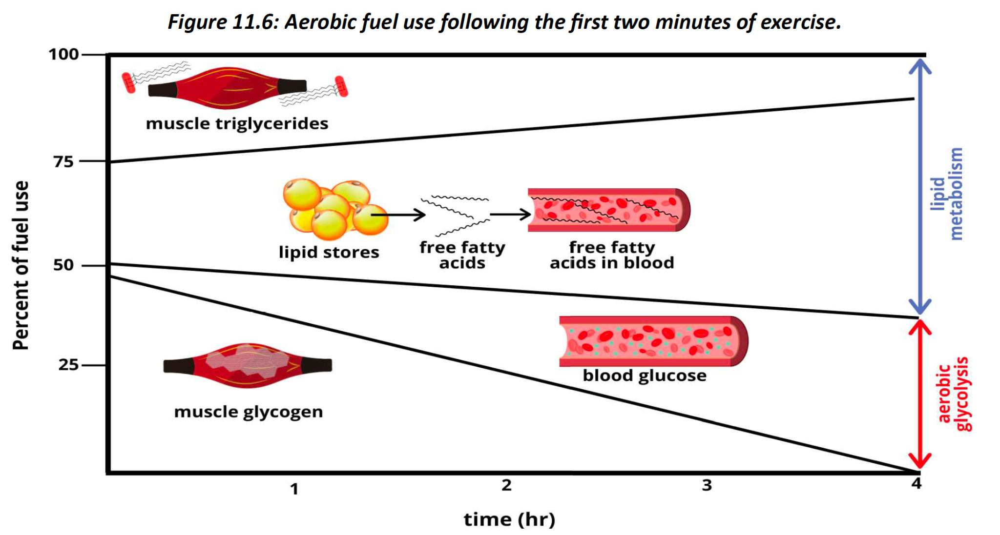 After 2o minutes - we start dipping into our main fuel source for extended activities: the aerobic metabolism of lipids. Some of these lipids come from our intramuscular fat – triglycerides stored within muscle.