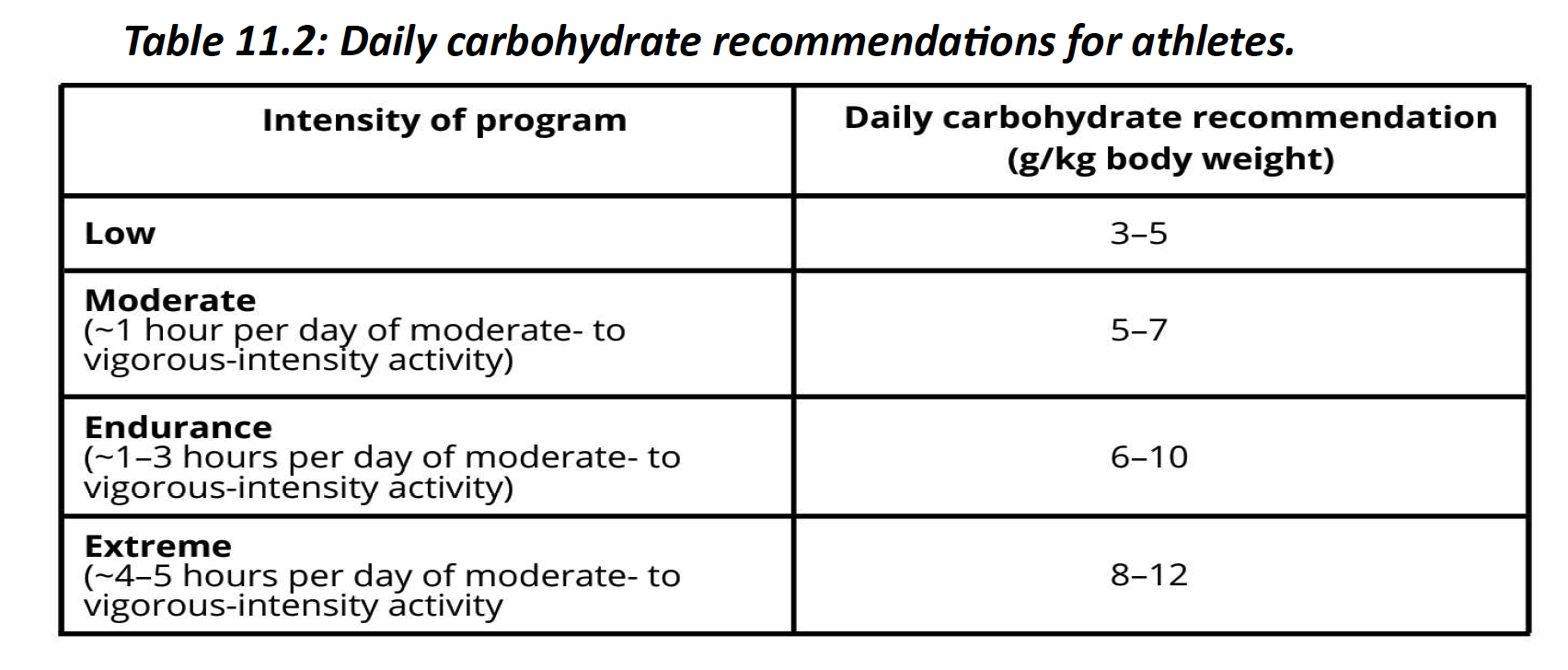 10–12 g/kg body weight of carbohydrate is recommended per day for the two days preceding the activity.