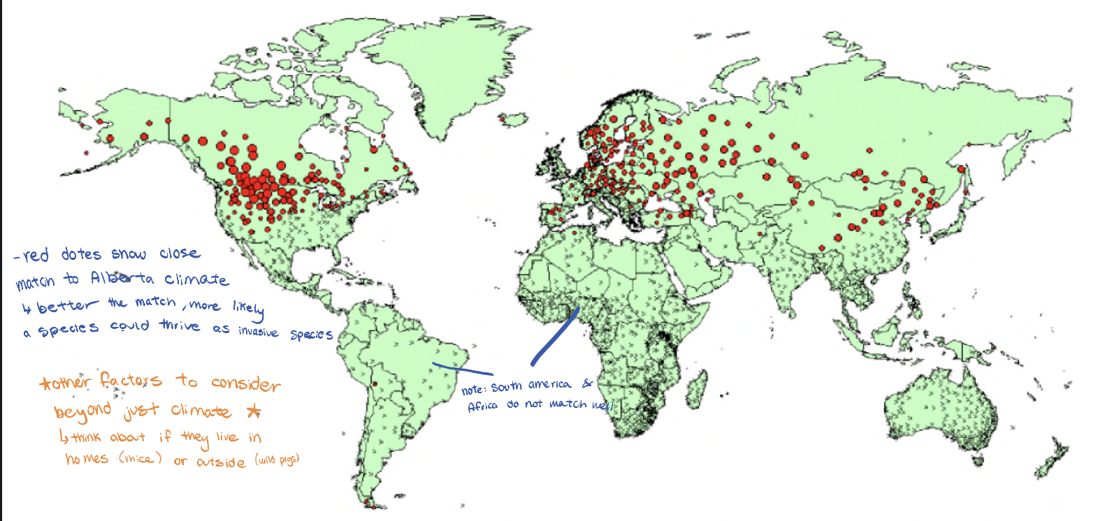 Use of red dots to indicate suitable climates in Alberta for potential invasive species.