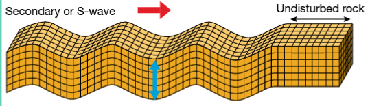 S-waves: Moves only through liquids, and the energy moves perpendicularly