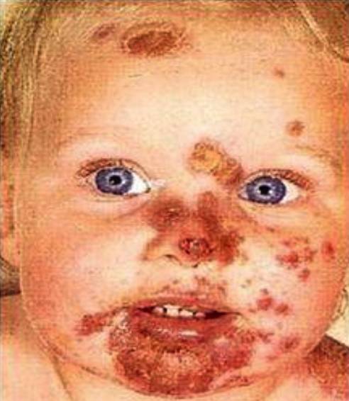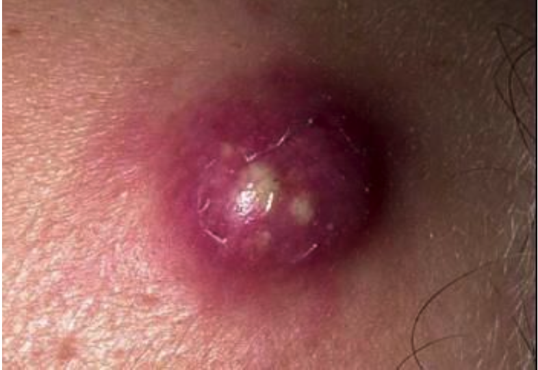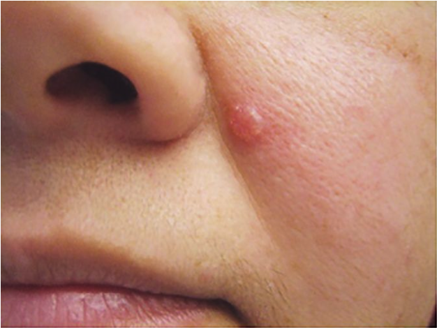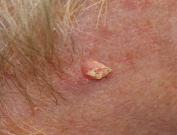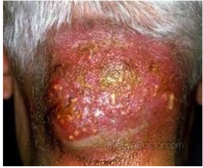 Firm, scaly, erythematous ”red from inflammation”, or ulcerated