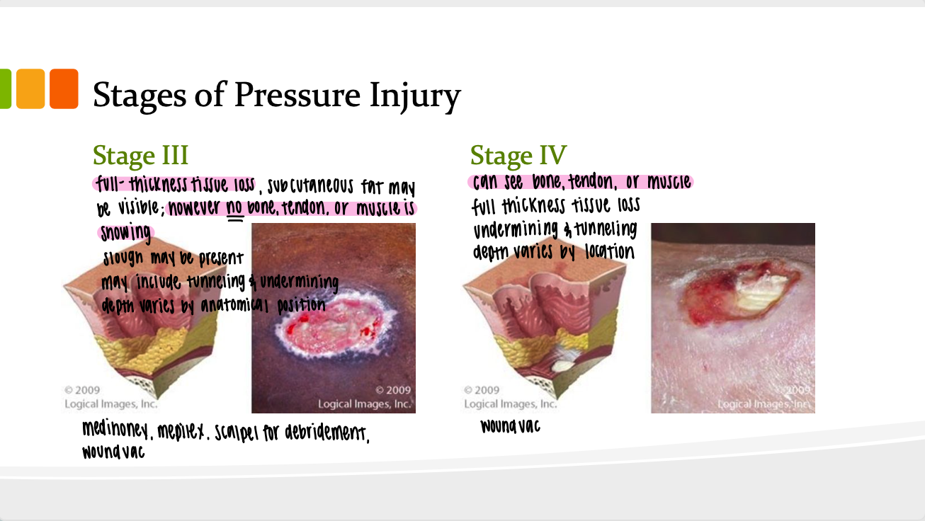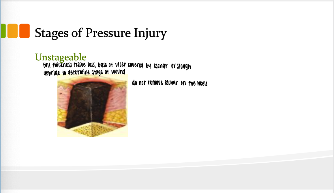 Full thickness tissue loss: subcutaneous fat may be visible. Muscle, bone, or tendon is not exposed. Slough may very well present as a yellow or white mucus that can complicate healing and may require debridement to promote granulation.