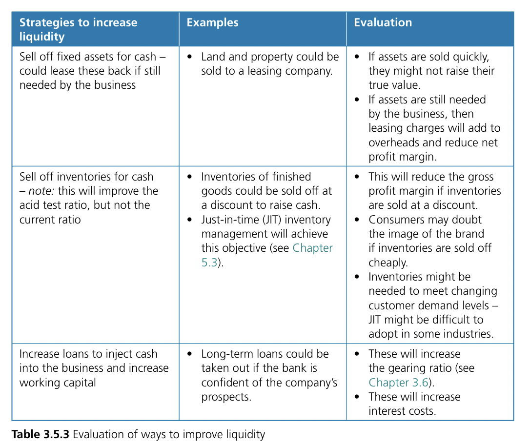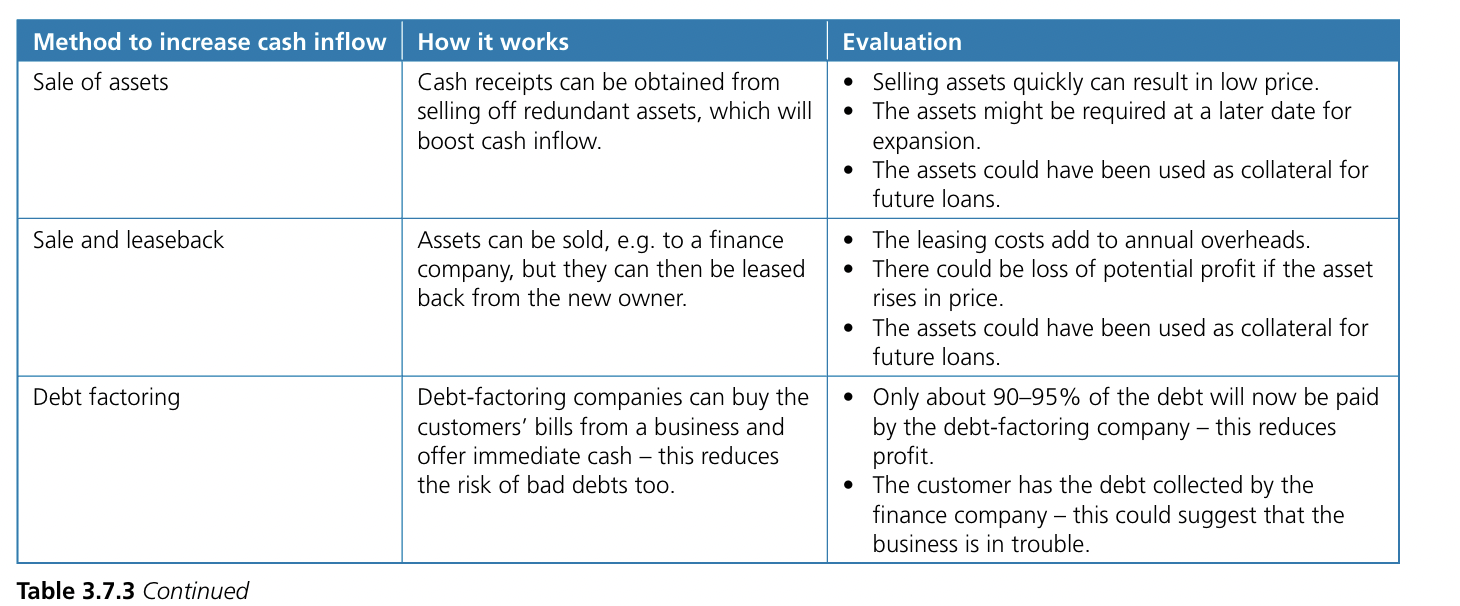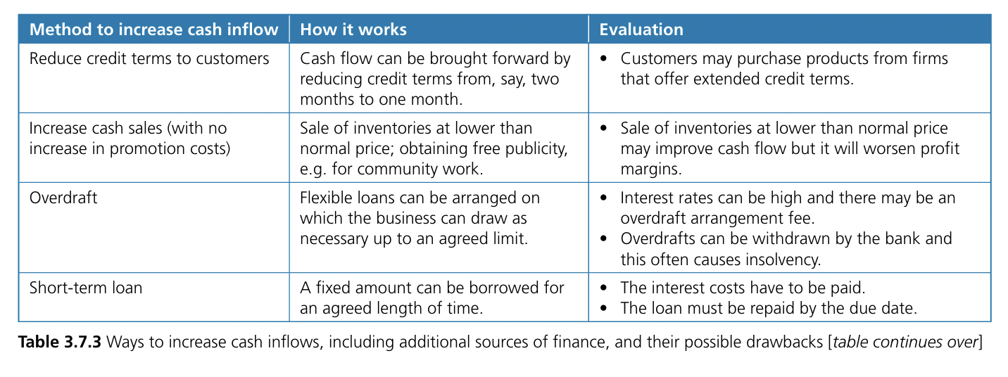 [[!! If you suggest ‘cutting staff and cheaper materials’, this may reduce cash outflows, but what will be the negative impact on output, sales and future cash inflows? This suggestion will nearly always be inappropriate for an examination question on improving cash flow !