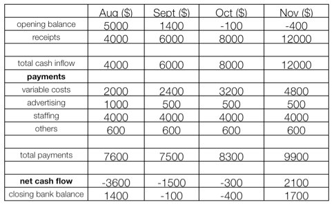 - By showing periods of negative cash flow, plans can be put in place to provide additional finance – for example, arranging a bank overdraft or preparing to inject more owner’s capital.