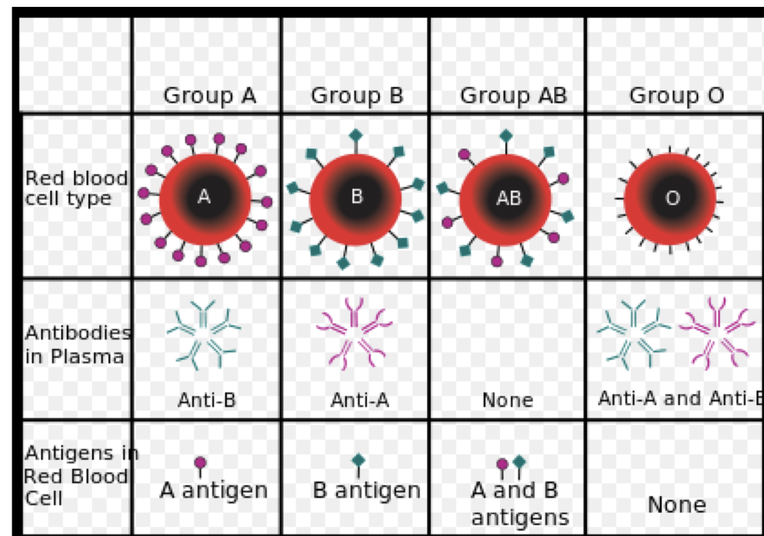Antigens: A, B carbohydrates on RBC membrane; antibodies reciprocal in plasma.