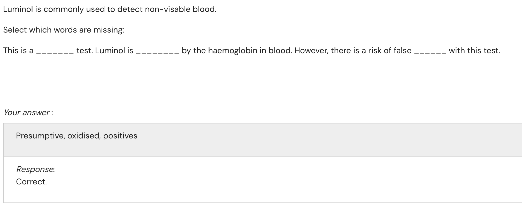 Blood: Luminol test – a chemiluminescent reaction that indicates the presence of blood even when it is diluted or washed away.