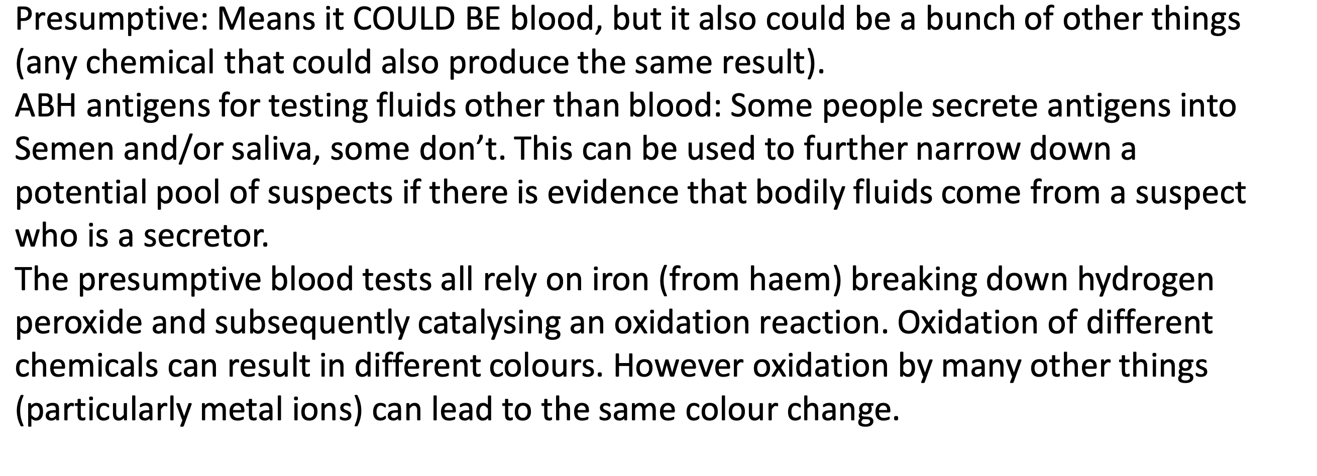Presumptive ≠ definitive; many oxidising agents or metals can mimic blood reactions.