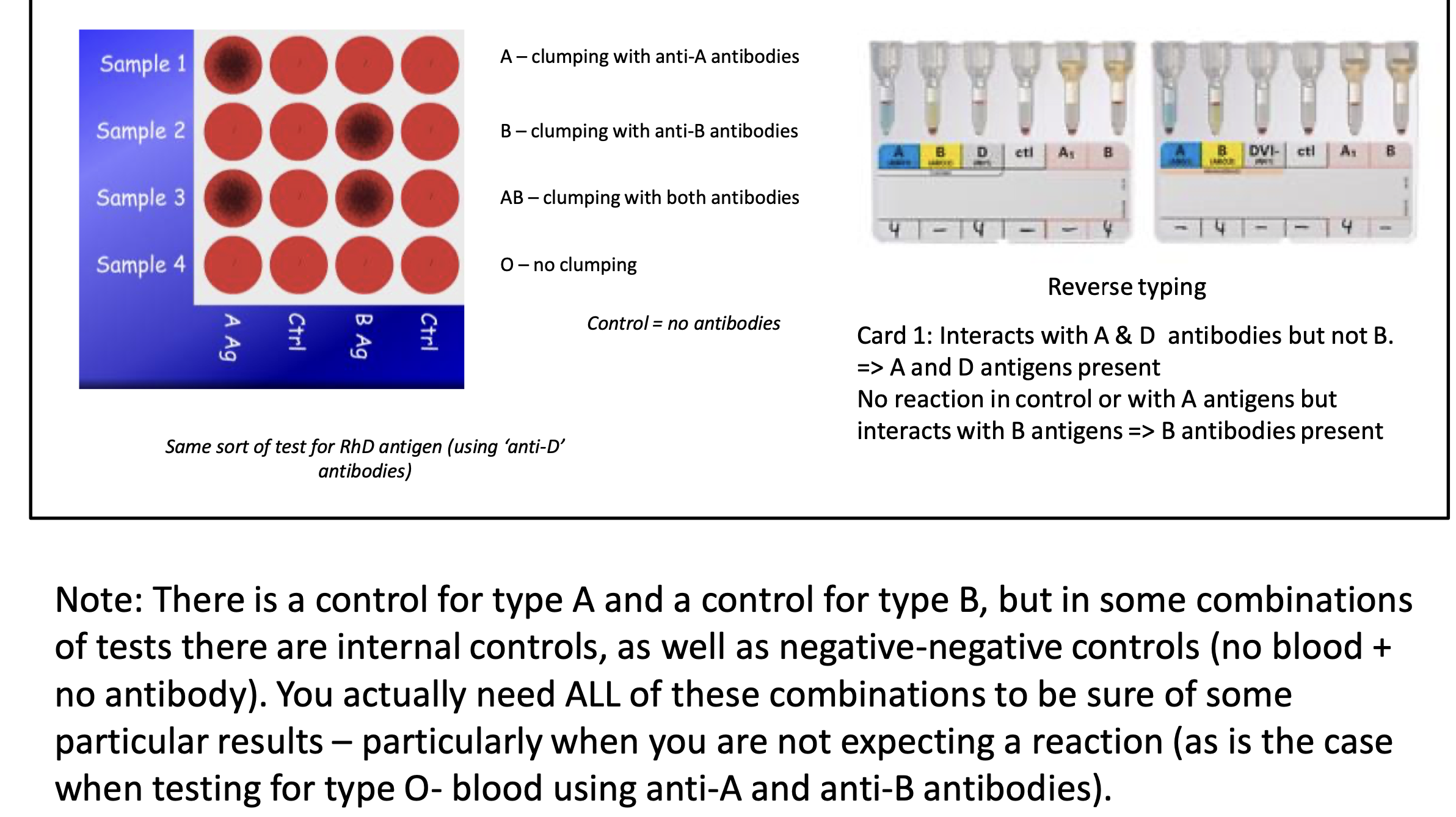 Reverse typing: patient serum + known A/B RBCs to confirm reciprocal antibodies.