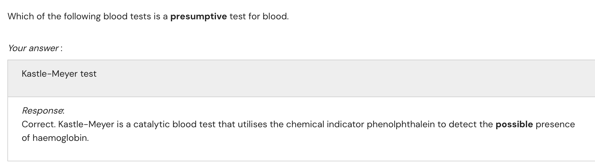 Blood | Haemoglobin | Colour tests (Kastle-Meyer, o-tolidine, Luminol, etc.) | Takayama, Teichmann, ABAcard, precipitin, DNA profiling |