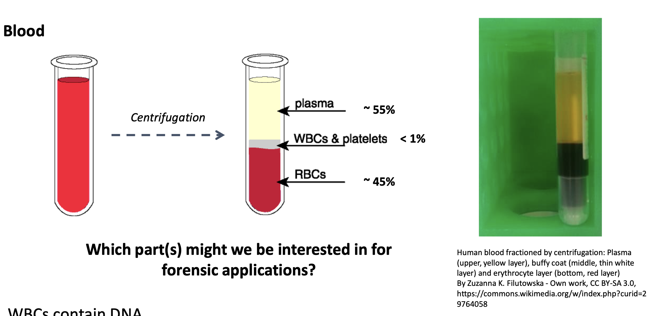 Blood: DNA profiling – utilizes PCR (polymerase chain reaction) to amplify DNA from blood samples for individual identification.