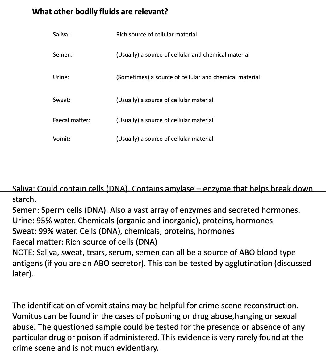 Source of DNA (epithelial cells) & potential ABO antigens (if person is an ABO secretor – of population).