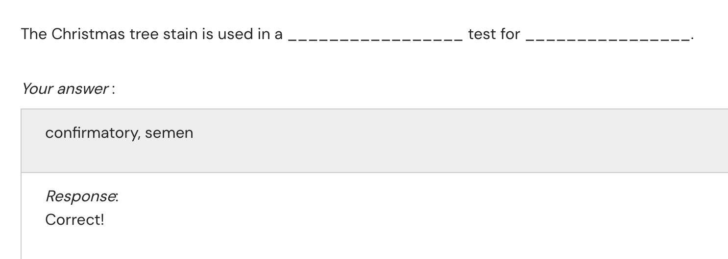 Semen: Acid phosphatase test (AP) Test – identifies the presence of the enzyme acid phosphatase, which is found in high concentrations in seminal fluid.