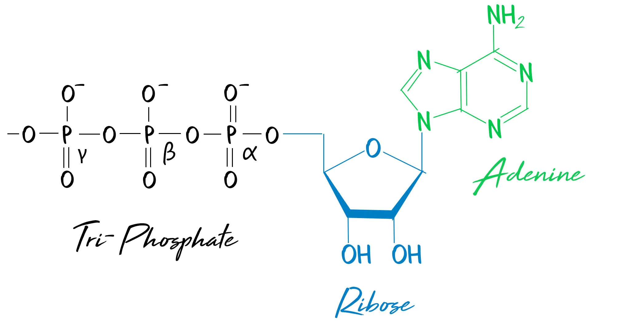 Adenosine triphosphate (ATP) is a phosphorylated nucleotide. It is composed of ribose and adenine, which form adenosine, with 3 phosphate groups attached.